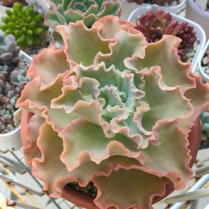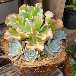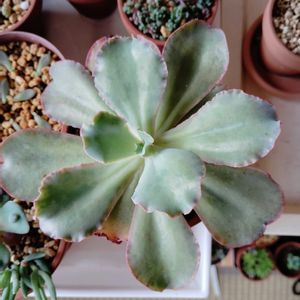 高砂の翁 見切り品なのか200円位でホームセンターで購入。 後々から大型株になる事を知り頑張って大きくしようと思っていた矢先購入2ヶ月ほどで突然の落葉、落葉の嵐… 根腐れかとチェックし植え替えもしましたが2日後あたりに腐ってしまいました。 葉挿しが1枚成功しているので大切にしてます!