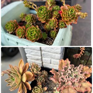 お疲れ様です🍵 朝からずっと☔️です せっかくの休日ガッカリ( ๐_๐) お外に出した多肉 ①桃太郎 丈夫で徒長しにくいし良い子 ②③放置のままの寄せ植え 仕立て直ししなきゃですが 可愛いです ④高砂さん ヒラヒラ(〜¯︶¯)〜 室内にて一定方向だったので 片方へ葉が寄ってます💧 ⑤やらかしました😭 やっぱりです 注意してても💦 葉焼け☀️毎年懲りずにやらかします 皆さんもお気をつけてください ではでは𖦹' ‐ '𖦹🌱