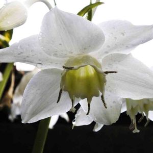 【アマゾンリリー(ギボウシズイセン、ユーチャリス)】 アマゾン川上流域原産、ヒガンバナ科多年草 花色は純白で中央が淡い黄緑色、芳香を放ち、つけ根は長い筒状で先端が6枚の花ビラに分かれ、うつむきかげんに咲く。 草丈:40〜50 cm、花径:6〜10 cm 花色:白 開花期:10月〜2月 ときわミュージアム@宇部市