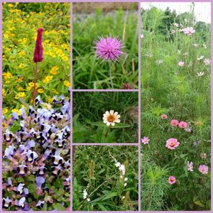 朝散歩🐶 散歩コースにジニアがいっぱいのお庭💞 トレニアも混じって、綺麗でした💞 コスモスの中には、百日草。 アザミは、あぜ道に。 白い花はもあぜ道に咲いてました。名前はわからない😖 《 みんな違って みんないい 》