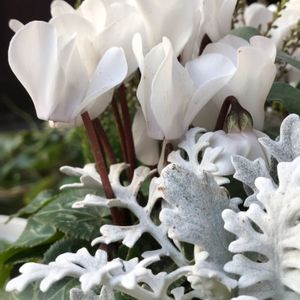 おはようございます😃 今日もポカポカ☀️ 🤍ガーデンシクラメン 白🤍 シロタエギクと寄せ植えにしました🤍🤍 花友さんのpicでやっぱり❗️素敵と思い連れ帰りました💗 花言葉どおり『清純』🤍❤️🤍
