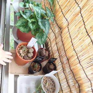 屋外:北側 窓手すり組 シクラメン2鉢は、非休眠で夏越しになりそうです(上) リトープスたちは、久々にチェックしたらぐいぐい徒長中😅緑鉢のリトさんはほぼ全滅してしまいました😢根をいじった後の乾燥が足りなかったと反省😵💫(中央) レウィシアさん、また咲くのかなぁ?(下)