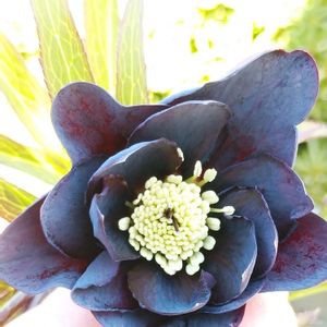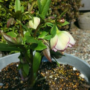 2019年のクリスマスローズ展で購入したダブル糸ピコティ×セミダブルクレオンの未開花株が、咲きました。 カップ咲きの小さい花が可愛いです直径三センチくらいのほんとう小さい花です