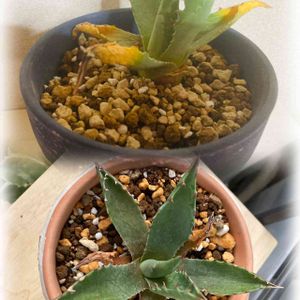 アガベ モンタナの葉っぱも枯れたようになっています。上が最近、下が色が戻った4月始めになります🌱アドバイスして頂き元気な苗に戻りました。根っこはしっかりしています。 一つ前にUPしました屈原の舞扇と同じでしょうか? 宜しくお願いします🙇♀️