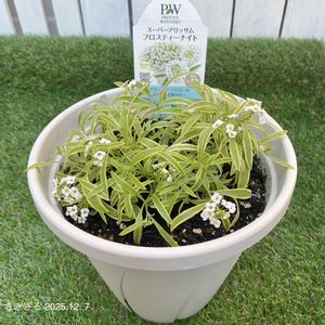 🌼お花便り 【#スーパーアリッサムフロスティナイト 】 🗓️定植2025-10/29 → 12/7 (5w4d) 🗓️12/7🌱4号スリットから🪴7号鉢に定植 🗾愛知・耐寒性ゾーン8b 🧭南西 ☀️4時間 🪴7号 🚿--- 🧴--- 我が家に来てくれて📦植え替えをしようとポットから出してみたら📌④根がちょっこりしかなかったので4号スリット仮植えでスタートしました📌⑤ 時が経ち(表現大袈裟💦39日ね…😁)あはは📌②お花が咲いてくれたのでそろそろ大丈夫かなと思いスリットから出してみたところ📌③だいぶ根が増えてくれたので7号根張り鉢🪴定植しました📌① これからは美しい葉を存分に楽しみたいと思っています✨本当に申し訳ない話だけれどお花より🙊美しい葉が好きです🥰 同じお花を育ててるみなさんどんな感じに生長していますか?是非教えて下さいね☕️🐵 PWスーパーアンバサダー2025 でいただきました