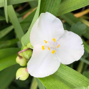 シロバナツユクサ。 道端の植え込みで咲いていました。 実は、次の日この子はとっても不思議な現象を起こしてたんです!! GSの皆さんに、せひ知ってもらいたくて。 もしかしたら、学術的にすごい発見かもしれないかも🐰 何が起きたるか、想像コメントをお願いします🧡