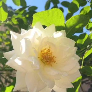 秋晴れの空と ツル薔薇アイスバーグ 今年は春からずっと咲いてくれました(‘д‘ ) ツルは一季咲きじゃなかったのかなぁ (´・ω・`)?✨
