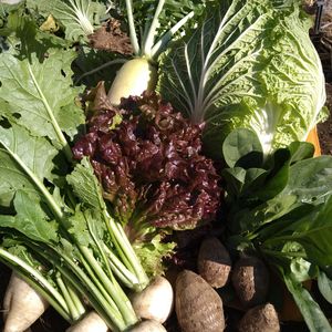 野菜収穫してきました\(^o^)/ 大根、白菜、カブ、ほうれん草、里芋、サニーレタス…… 感謝していただきます‼️ でも春菊は、発芽率悪くて失敗😣 ザンネン😢