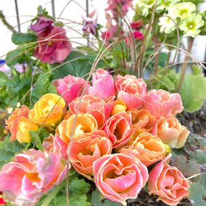 2月初め頃植えた薔薇咲きジュリアン🌹 こんな色になりました✨ ひとつの株が花束みたい♡ でも手前のピンクも奥の白(グリーン)も 買った時の色が好きです😁