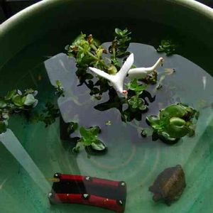 家の中のメダカ鉢です。亀は箸置きです。 ここのメダカたちは去年生まれた稚魚。 それが産卵し始めました。 孫世代だあ~( ^∀^)‼🐠 グリーンはウォーターバコパとホテイアオイ💚