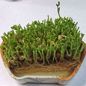 さてコレは何でしょう? 答えは「一回刈り取って食ってしまい/次回収穫のために嫁がキッチンで育てている豆苗」です。 今年は野菜価格の高騰で豆苗が大人気だそうですが、嫁はガメツイので多重収穫を目論んでます。1本だけヒョロッと延びた芽が盆栽みたいでカワイイ。 今年に入ってから植えたサボテンでさえ既に枯らした嫁でも、コレなら水だけで育てられるようです。