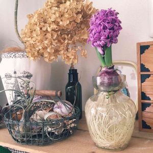 昨年末に投稿したヒヤシンス3姉妹✨ それぞれに花を咲かせ始めました🌸 ひなたぼっこ効果かな✨ 部屋中よい香りでいっぱいです😊 根っこも相変わらず元気で、頭に花を咲かせ楽しくフラダンスしています(笑)