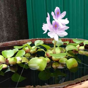 メダカを飼っている味噌樽で ホテイアオイの花が咲きました!!