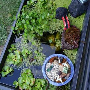 軒下のプランタービオトープ。 メダカの赤ちゃんが数匹✨ 蕾をつけた睡蓮は咲くことなく、途中で蕾が落ちてしまったけれど、 赤ちゃんメダカは嬉しいな😆