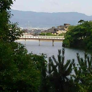 大和文華館から蛙股池を臨む。 向こうに見えるのは春日山。 木に隠れて見えないけど左側には若草山があります。
