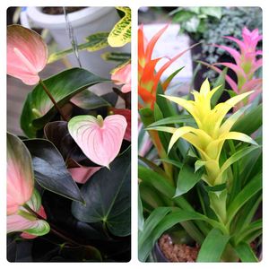 贈り物にいかがでしょう?三色MIXのグズマニアは一鉢でもお部屋を華やかにしてくれそうですね♪アンスリウム“レインボーチャンピオン”は、ピンク・緑・チョコレー色と、なんとも言えない色合いがステキです。珍しい種なので選ばれる方は、間違いなく「お目が高くていらっしゃる!」となる一品です!(^皿^)