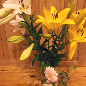 帰り道にいとこのおじさんに会ったら、畑で採れた野菜とゆりの花をもらったよ。 ガーベラも花屋さんのアプリ登録したらもらったものです。 花より葉っぱ派だけどIKKOさんの家みたいでちょっと嬉しい😊