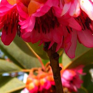 ロドレイア(シャクナゲもどき)マンサク科 大きな木に、たくさんの赤い花が。 下を向いて咲くのが残念。右下が、真下から撮った写真です。 先日、京王フローラルガーデンアンジェにて。 (5月末で閉園とのこと)
