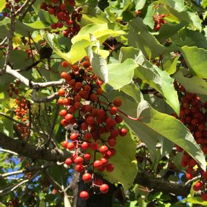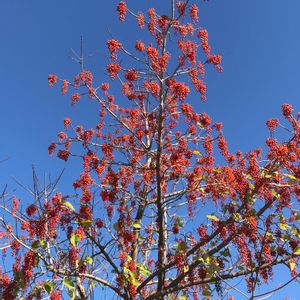 おはようございます😃 以前から、気になっていた、赤い実の名前がわかりました。南天桐。 大きな木に赤い実が、青空に映えて綺麗です。近くの、花植木センターにて。