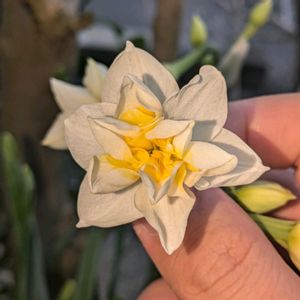 11年めにして… ようやく咲いてる姿をෆ˚* って、気づいたのは 3年前位ですが(>ᴗ<) 毎年毎年、霜に当たって しおしおになってた蕾 今年は暖冬のおかげか? やっと…そして まさかの八重咲日本水仙とは Σ(•ω• ノ)ノ クシュクシュの副花冠が スクランブルエッグみたいです◌𓈒𓐍🍳𓏸𓈒 そして、皆さんが言うように 優しい香りがしました...♪*゚