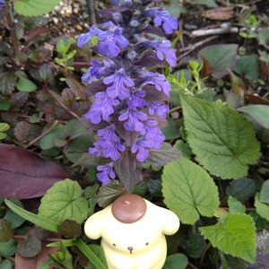 ❶❷小さな花壇にアジュガも咲いてきました 一本だけ離れて咲いていたのでポムポムプリンUo・ェ・oUとパチリ📱 🏷ワンワン祭り参加します ❷アジュガ(十二単衣)💜 ❸庭桜🌸 ❹🌷とビオラ ❺フェンスにアケビ🟣🌿