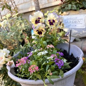 冬の寄せ植え完了☑️ パンジー パルムディールは、お一人様でゆったり。天の羽衣はアリッサムと。玄関前が華やかになりました🥰