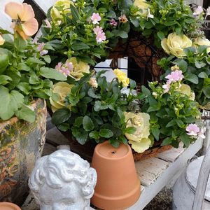 油断するとすぐ投稿感覚が空いちゃう😅 手前の2鉢はフリルパンジー 天の羽衣とシエルブリエの寄せ植え🌱 先週の木曜日に植え付けました 作業始めるのか遅くて さあ隙間に土入れってなったときは 西陽がキツくなってて 隙間ぜんぜん見えず💦 慌ててキッチンに移動して 久しぶりに部屋で作業しました😇 今回は土少ししかこぼさず植え付け完了