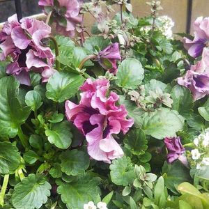 伝説の八重パンジー ファビュラス•*¨*•.¸¸♬︎ お迎えした時より濃い色合いで 咲いてます🌸 ファビュラスさんの お隣はうえたさんの天の羽衣さん🌸 お迎えして2週間ほど✨ やっとお花が咲きました🌸 まだお顔がはっきり 見えないケド💧 これからが楽しみです〜🌸✨