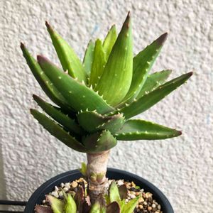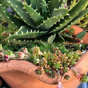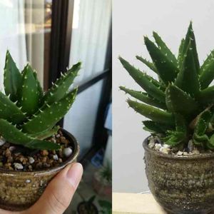 Aloe nobilis アロエ 不夜城 左写真 2019/10 右写真 2021/1 子吹きする子吹きするとは聞いてましたが、約1年でかなりの数子吹きしました。親株からグルっと一周子吹きだらけです。その数14『子』でした。 要約 増えすぎ。 欲しい人いたら投げます。