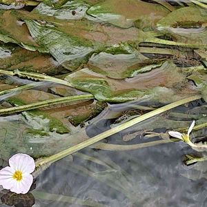 ミズオオバコ( 水大葉子 ) 愛知県 トヨタ市 松平郷( まつだいらごう )の ビオトープに 咲いていました 目立たない 小さな 白い花 葉は 右下の写真に 写っているものらしいです