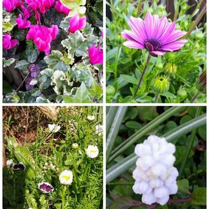 こんにちは👋😃 いい天気☀️で気持ちいい⤴️⤴️ 花壇の花達も気持ち良さそう~💞 ↖️秋から咲き続けている3年目ガーデンシクラメン ↗️一昨年挿し芽して昨年秋に地植えしたオステオスペルマム ↙️こぼれ種のネモフィラとノースポール ↘️白のムスカリ