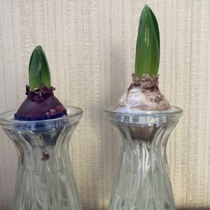 ヒヤシンスの水栽培。 息子達が幼い頃に使ったガラスを使ってます😘 少し葉が飛び出してきました🤭🙆♀️