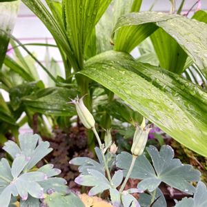 オダマキの花が終わり、種ができています。後ろの葉っぱはシランです。 オダマキの葉ははーと型でかわいいですよね。