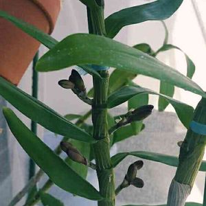 去年花が完全に落ちてから買ったデンドロビウム どんな色かも分からず開花が楽しみ