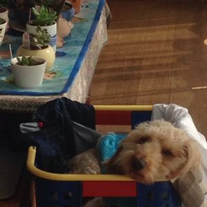 パックはどこ?探したら縁側に避難した子達の横の洗濯のカゴの中でひなたぼっこを🐾🐶