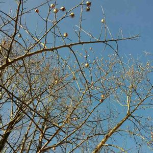 すっかり葉を落としたモミジバフウ。 枝先に実がたくさん残っています。
