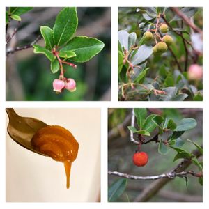 先程他の方がアップされていましたが、公園にも多くのイチゴの木が植えられています。見たら花はちらほら。可愛い花が咲きます。実がイチゴの様にというのでついた名らしいのですが、最初見た時はヤマモモだと思いました。右上の実は今熟れ始めています。右下赤くなりました。此方は冬赤くなります。 この実は一年かけて熟れます。 左下:この花から取れたハチミツです。 見かけはトフィー(溶けたキャラメル) 味も同じように甘く濃厚ですが、苦味があります。そのため家族には不評😂