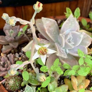 左写メは同僚のお宅の 「クリーピングタイム」🌸 センペルビウや金の成る木、クリーピングタイムも頂きました♥️ クリーピングタイムはとってもいい香りがします💓今朝の植え替えなので..根付くけ心配😿