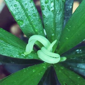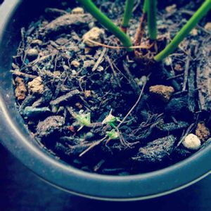 ラカンマキの根元で育ててる、エアプランツの実生苗。 フックシーのモシャモシャにからまってた種から発芽させたので、何の種類かは不明(笑) Tillandsia ???