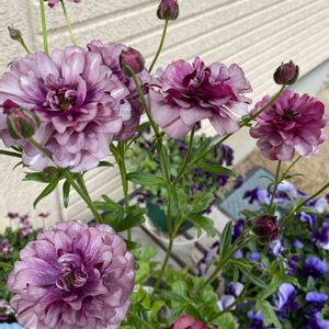 おはようございます2☀️ ラナンキュラスラックス ティーバ🎵 昨年12/8にお迎えした小苗ご開花しましたー😆 ウチのラックスの中では初開花です☺️ いいパープルしてるぜー(*≧∀≦*) 回りに蕾もいるし、他のラックスも蕾上がってきてるし、ラックス祭りは近いのかー😆