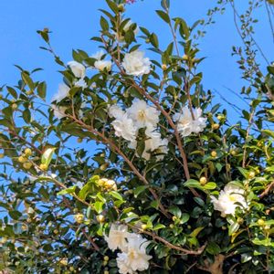おはようさん🎶 この木!何の木!… サザンカに似てるけど… 初めて見た時は驚き‼️ 台湾椿‼️ 蕊が可愛い♡ 真白のお花♡ 蕾が沢山付いてる♡ 暖かいので開花が早い気がします🤭🤗 🏷️白い水曜日♡