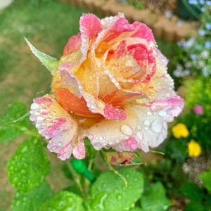 ⑽クロードモネ様 昨年の秋にお迎えしましたが、 我慢して咲かせませんでした。 この雨の中〜開花です。 花弁の色と雨の雫がぴったりマッチして、 まるで宝石の雫のよう💎 ピンクに淡いオレンジイエローの絞りが入る ロゼット咲き中大輪。 独特の華やかさとかわいらしさを併せ持った 魅力的な品種です。 ローズをベースにスパイシーと フルーティーの混ざる強香花。 たまりません💓 系統:S シュラブ 花色:淡い黄色とピンクの絞り 花形:ロゼット咲き 花径:中輪 芳香:中香 香質:ティーにパウダーとダマスク 開花 :四季咲き 樹高:1.1m 樹形:木立樹形 普通タイプ