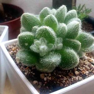 想像と違って白い花♡ 清楚なのにもふもふの毛。 このギャップがいいですね〜💗 置き場所のせいで、寒風に当ててしまって危うく星になる所でした💦 今も傷んだ跡が〜 そのせいか、下からお子様がたくさん出てきました🤗 もふもふカワイイ💕