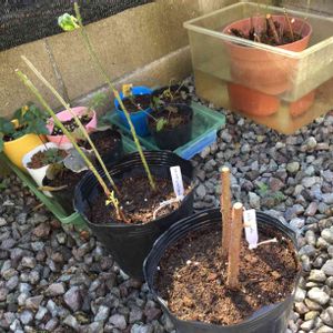 今日から仲間になるバラ科キイチゴ属のホワイトピーチベリーさん3株だ。(ポットは2つ 雪見苺とも呼ばれているな 元々は中国原産の鳥取生まれだそうだ。 近年(‘10)作出された桃のような香りで有名な「桃薫」のあの香りの遺伝子はこのホワイトピーチベリーさんらしいぞ みんな仲良くする様に! (野生種なので繁殖力が半端ないらしいから注意が必要
