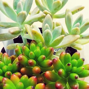 一昨日、道の駅に隣接する花屋さんで5鉢700円で購入しました。軒下の隅っこでジュレてる子や溶けかかってる子もいました。徒長してる子も😰 30鉢くらいの中から選んだ子達は、あまり紅葉していないけど…。とりあえず元気そう。 モフモフ系の🐰ちゃんはこの子だけでした。以前からいいなぁと思っていたので救出しないと😤と連れ帰りましたが、寒さに弱いとGSで知りました😱。一晩お外で過ごしてしまった😱😱😱。でも、ずっとお店の軒下にいたみたいだから…大丈夫かな😅 今はおうちの中にいます。 今回、かわいく編集できるアプリを娘に入れてもらいました。でも、使いこなせない。ちゃちゃっと説明されたけどよくわからなかった😅。今回はこれで精一杯でした。