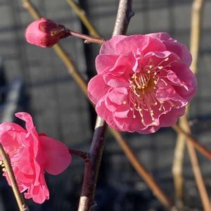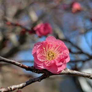 花友さんに開花を教えてもらったので、早速行ってきました。 風は冷たいがよく晴れて、青空に桃色の花がよく映えています。 昨年より遅い開花に待ち侘びていました。 🩷寒紅梅🩷 早咲きの梅です。