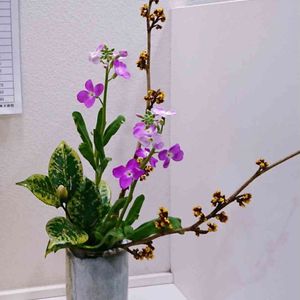 今年初のフラワーアレンジメント。斜めに交差する線を意識して。楽しい作品でした。#フラワーアレンジメント