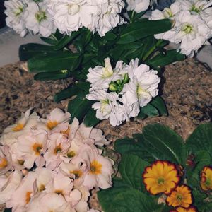 プリムラ ジュリアン(黄色)が、美しくて スプレーストック(白)と寄植え。 マンションの共有スペースにおきます。