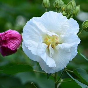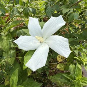 今日の散歩道🚶♀️🚶♀️暑い💦💦 緑道脇の純白の花 ムクゲの木の近くで咲く白花。 ネットで🔍 「ムクゲ サマースノー」 ? 如何でしょうか? 白花モミジアオイに似てるけど