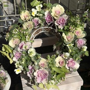 こんばんは😊 週末にリース作ってみましたー😆 我ながらなかなかの出来💖 使ったのは ハボタンジュエリーシリーズ みるくももか アリッサムレモンアンドピーチ みるくももかもいるんだけど これからモリモリになってきたら ハボタンに負けない存在感になるはず! 春まで現場維持出来ますよーに💕 誰も褒めてくれないから自分で自分を褒めちゃう🤣